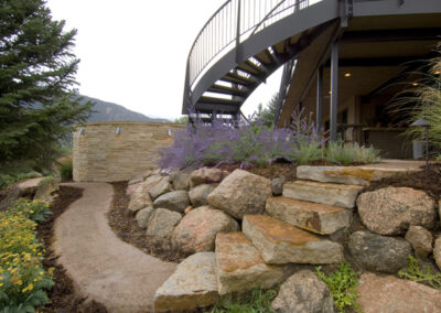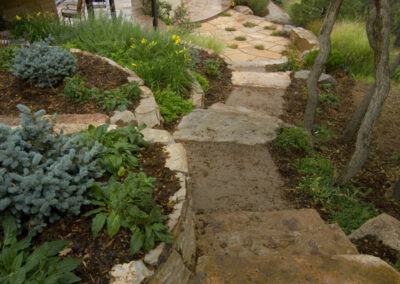 Fredell Enterprises’ Colorado Springs landscaping experience includes pathway designs. We utilize a variety of different materials, and we use that to create your custom walkway. Our landscape team offers a range of possibilities depending upon the desired look of the lawn, the intended pathway use, and project budget. Surface materials can range from colored stamped concrete to crushed rock. Concrete is the most formal material for a walkway surface. Asphalt has good durability and traction (for steep slopes) and is surprisingly cost-effective. Our most popular material, however, is something we call ‘soil cement’. This popular choice is made up of a mixture of breeze gravel (crusher-fines) mixed with cement and coloring. The cement binds the crushed material together creating a durable path that provides significant resistance to erosion from water and foot traffic. Soil-cement has a finished look similar to a trail. For a more formal look, we can utilize a variety of paver materials or natural stone.