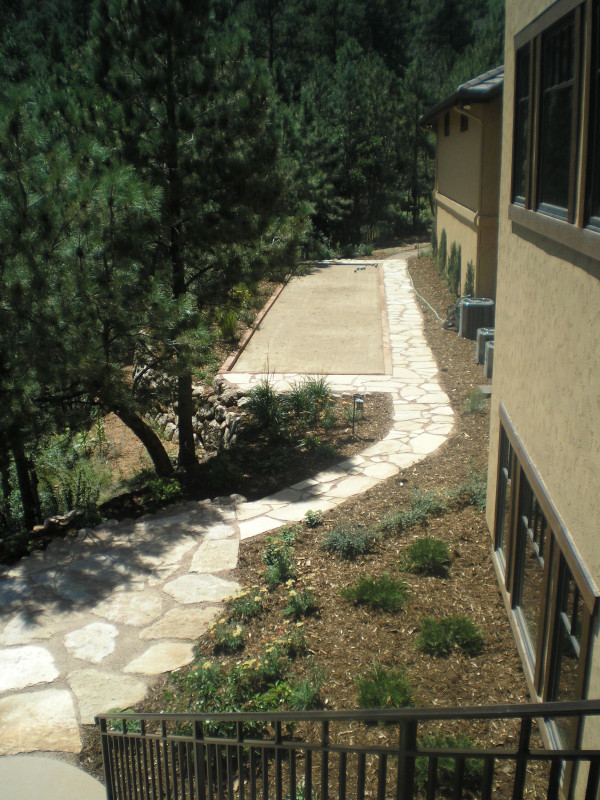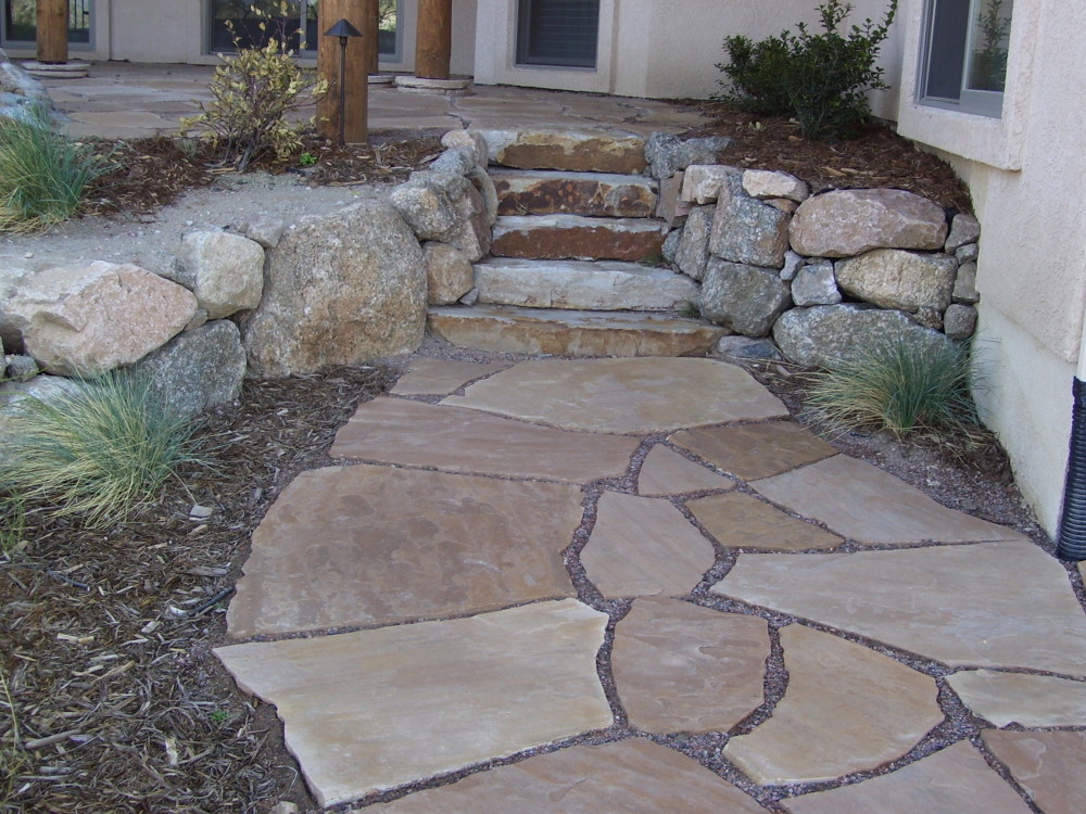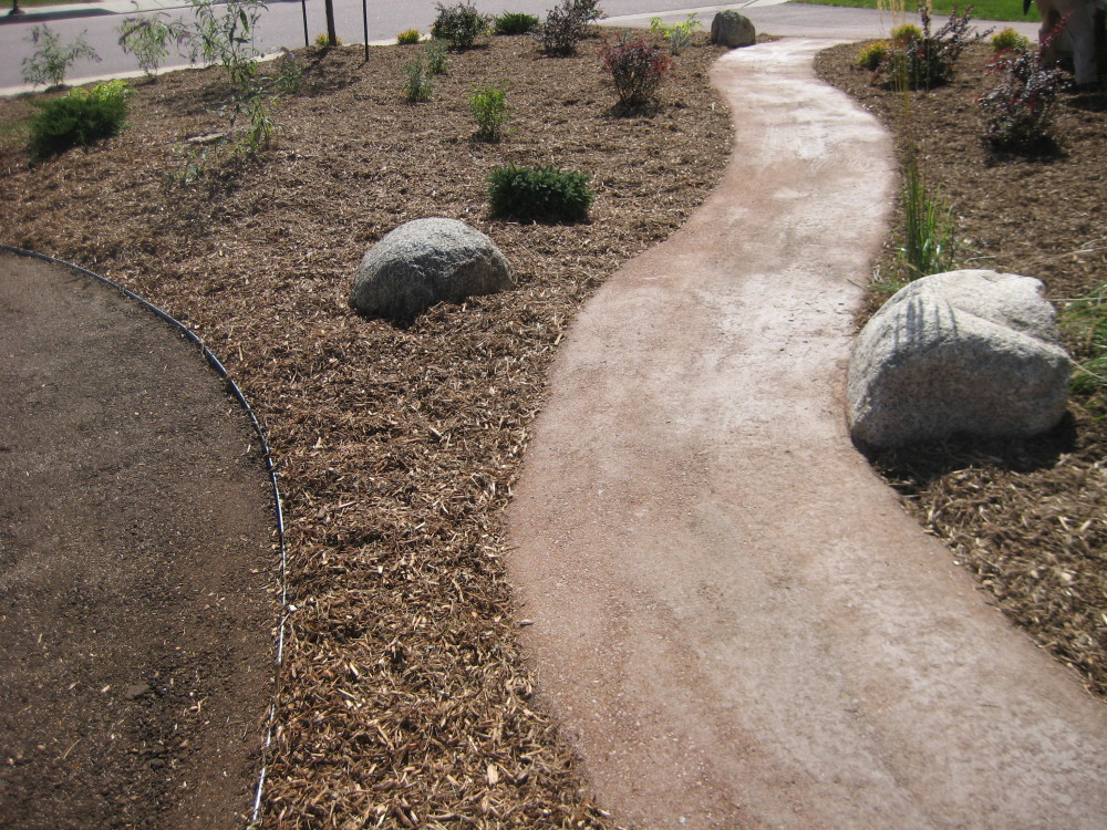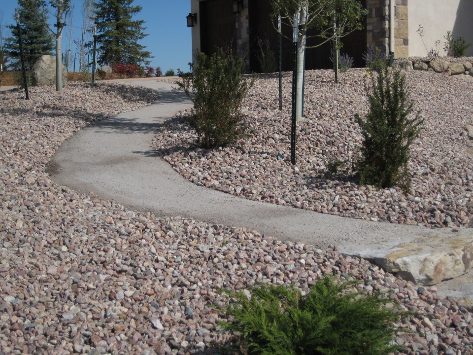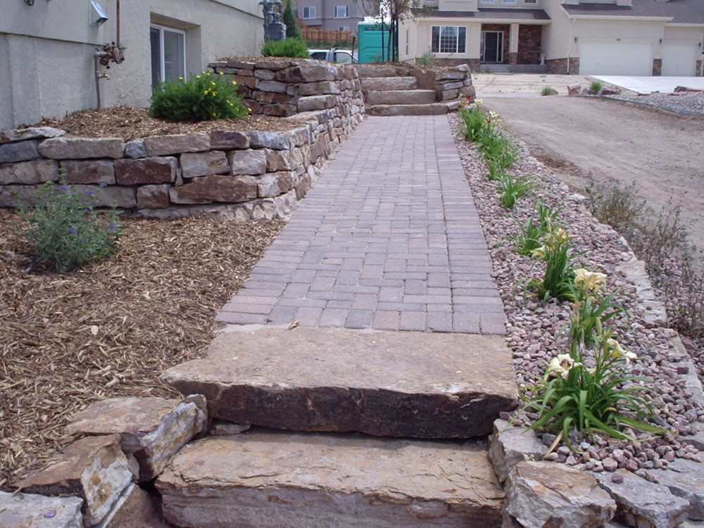Fredell Enterprises’ Colorado Springs landscaping experience includes pathway designs. We utilize a variety of different materials, and we use that to create your custom walkway. Our landscape team offers a range of possibilities depending upon the desired look of the lawn, the intended pathway use, and project budget. Surface materials can range from colored stamped concrete to crushed rock. Concrete is the most formal material for a walkway surface. Asphalt has good durability and traction (for steep slopes) and is surprisingly cost-effective. Our most popular material, however, is something we call ‘soil cement’. This popular choice is made up of a mixture of breeze gravel (crusher-fines) mixed with cement and coloring. The cement binds the crushed material together creating a durable path that provides significant resistance to erosion from water and foot traffic. Soil-cement has a finished look similar to a trail. For a more formal look, we can utilize a variety of paver materials or natural stone.