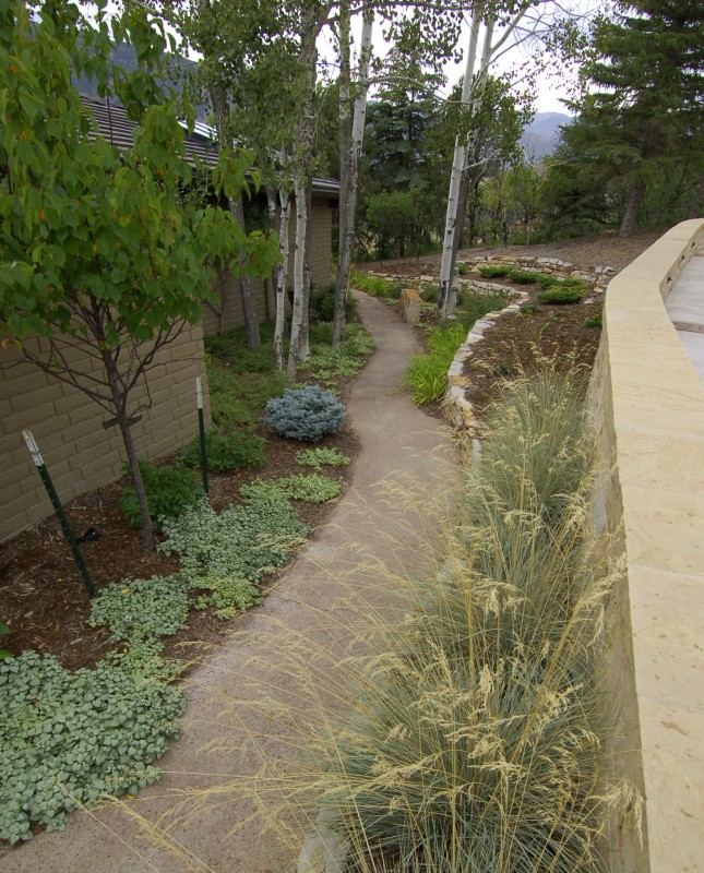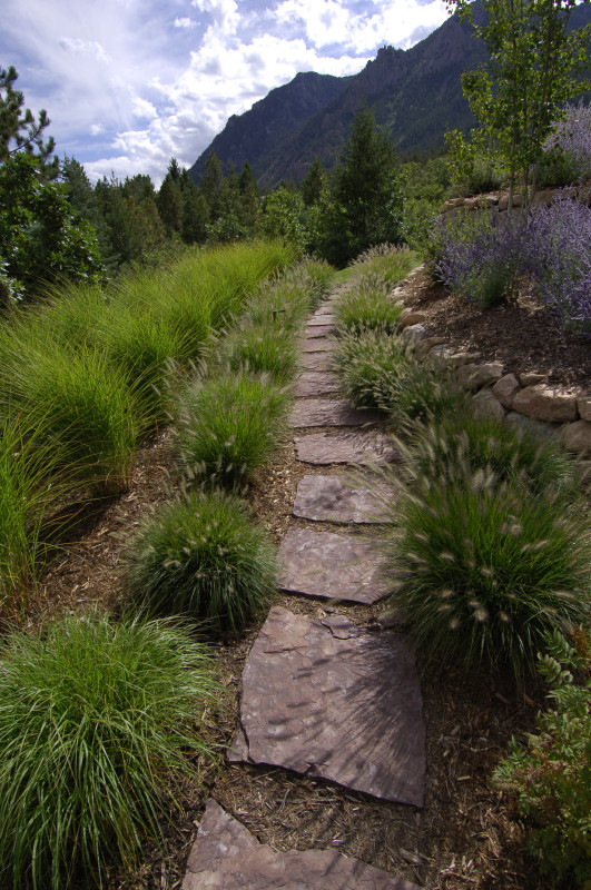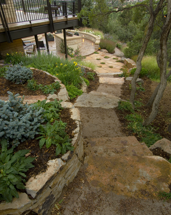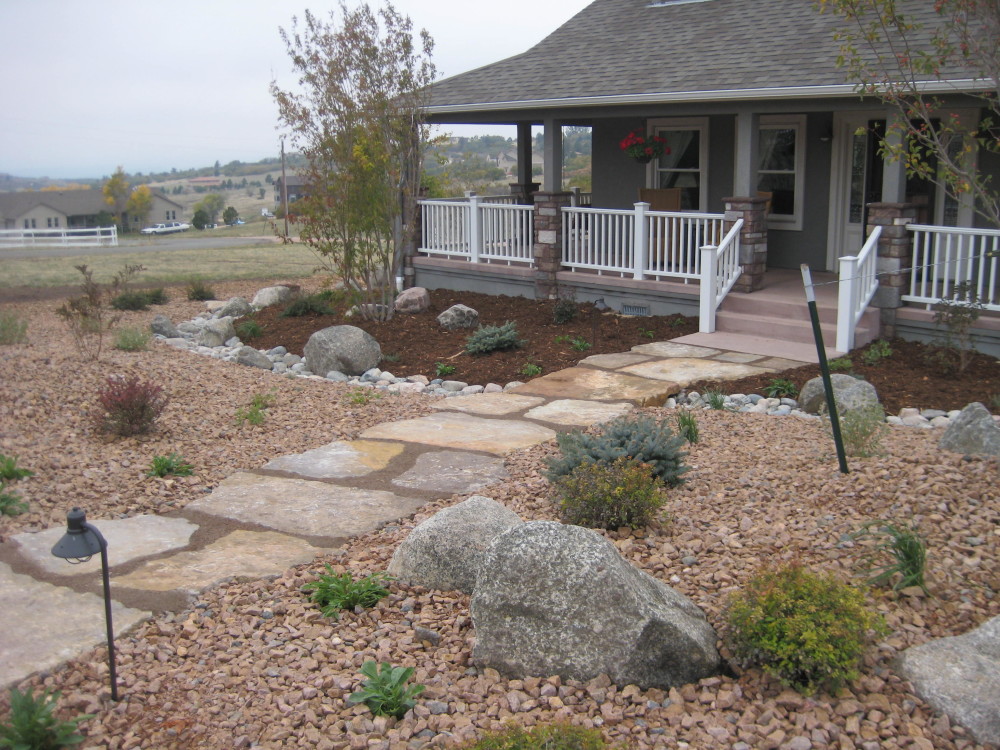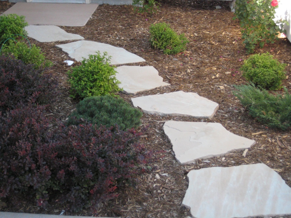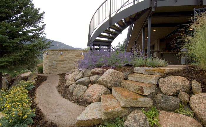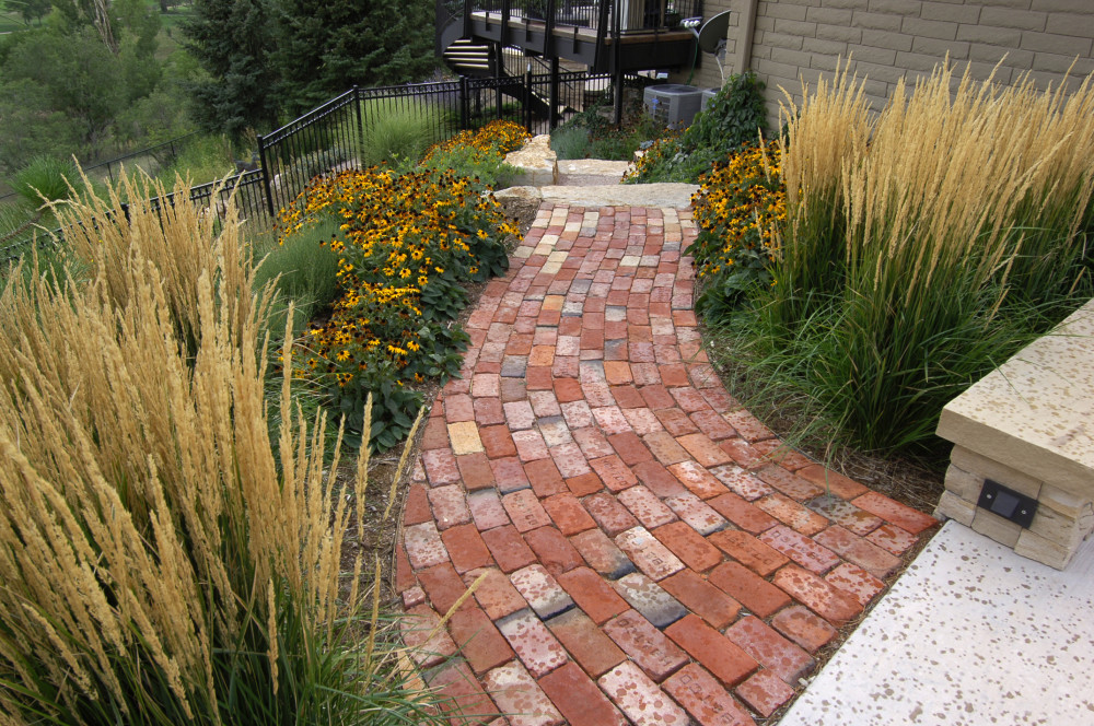 Fredell Enterprises’ Colorado Springs landscaping experience includes pathway designs. We utilize a variety of different materials, and we use that to create your custom walkway. Our landscape team offers a range of possibilities depending upon the desired look of the lawn, the intended pathway use, and project budget. Surface materials can range from colored stamped concrete to crushed rock. Concrete is the most formal material for a walkway surface. Asphalt has good durability and traction (for steep slopes) and is surprisingly cost-effective. Our most popular material, however, is something we call ‘soil cement’. This popular choice is made up of a mixture of breeze gravel (crusher-fines) mixed with cement and coloring. The cement binds the crushed material together creating a durable path that provides significant resistance to erosion from water and foot traffic. Soil-cement has a finished look similar to a trail. For a more formal look, we can utilize a variety of paver materials or natural stone.