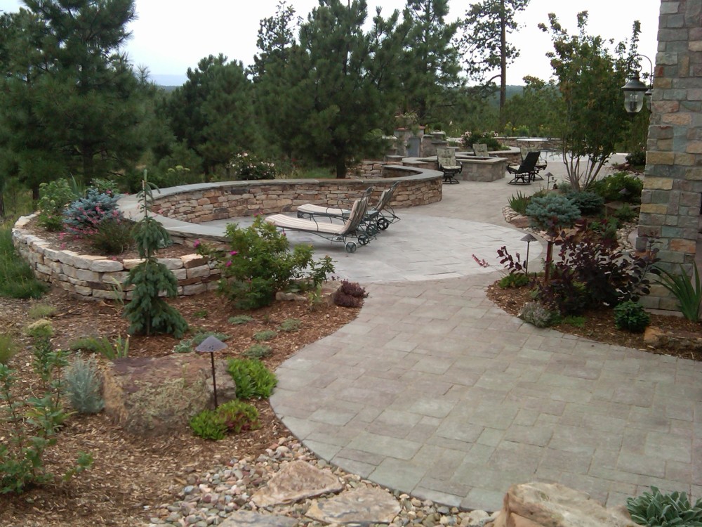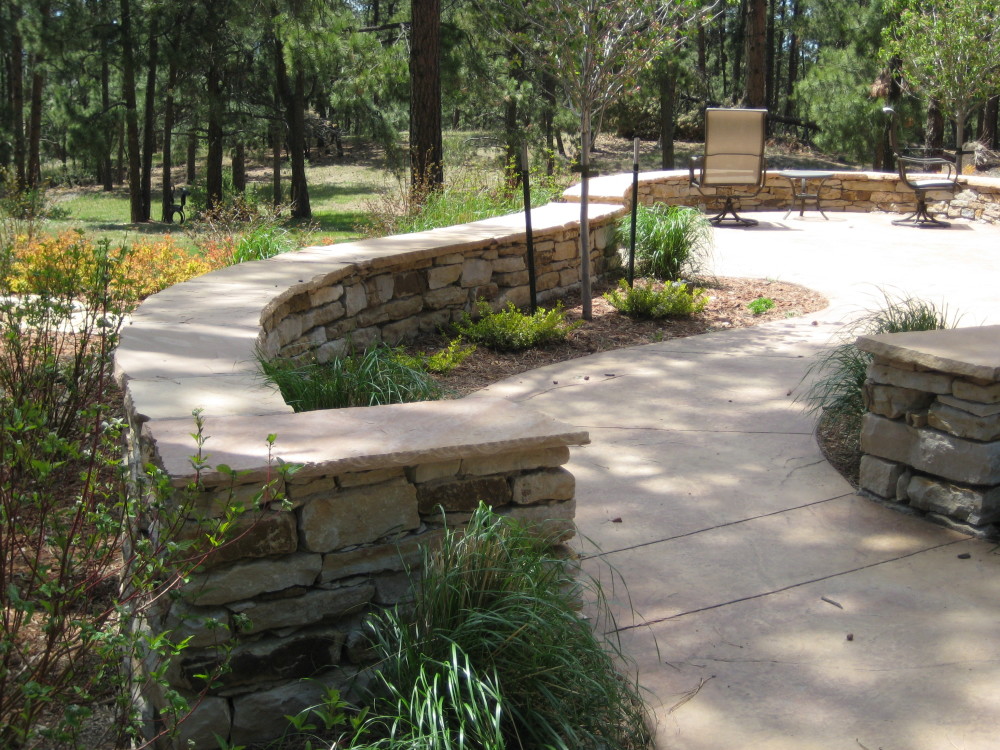 Seating walls are a great functional and aesthetically important addition to your outdoor living space design. Created from natural stone these landscape amenities provide structure and mass to outdoor living spaces. These low walls provide an enclosure and a surround to a patio dining area or fire pit. A patio seating wall can be created from any type of natural stone, brick, or manufactured concrete block. Freestanding Siloam stone walls with flagstone caps tend to be the most popular because of the appealing color combinations and ability to create a hidden mortar appearance. Low retaining walls can also be used for seating and also create terracing around your outdoor living space. Our Colorado Springs landscaping services include building a bench with a backrest into a retaining wall. Need outdoor fire pit seating? We can do that too. Locations of seating walls within a landscape can vary greatly from a formal patio area attached to the home to a campfire area at the edge of a property surrounded by native vegetation.