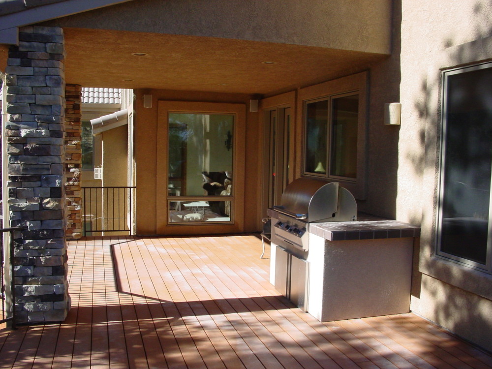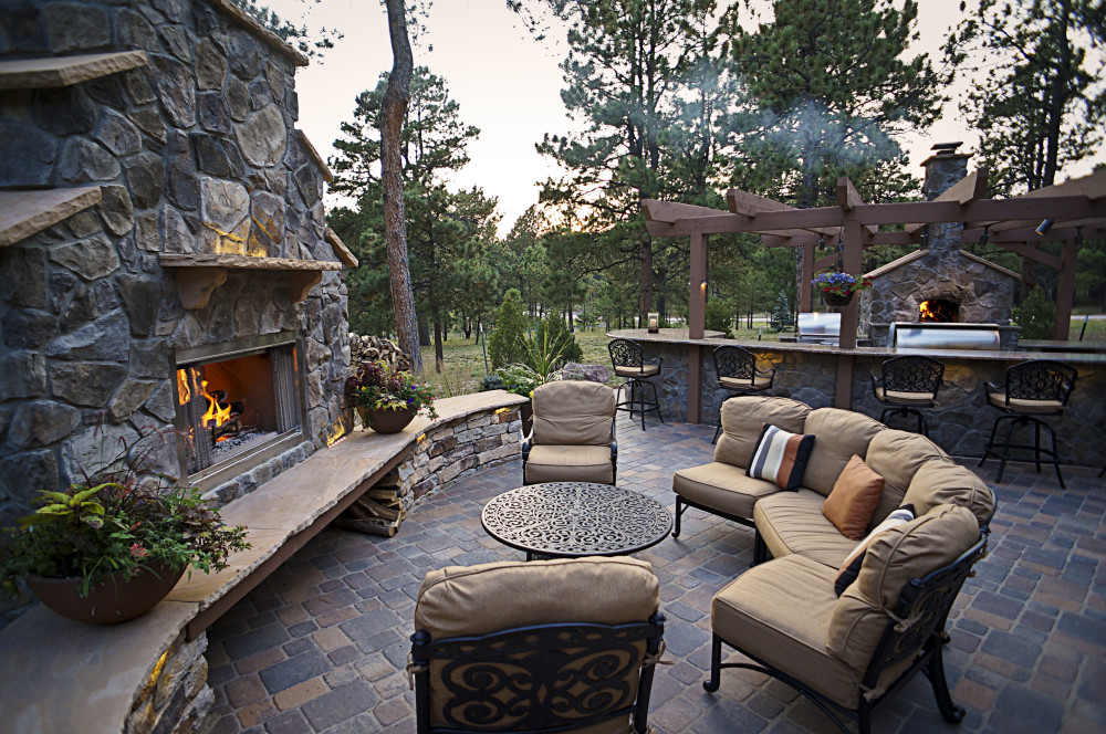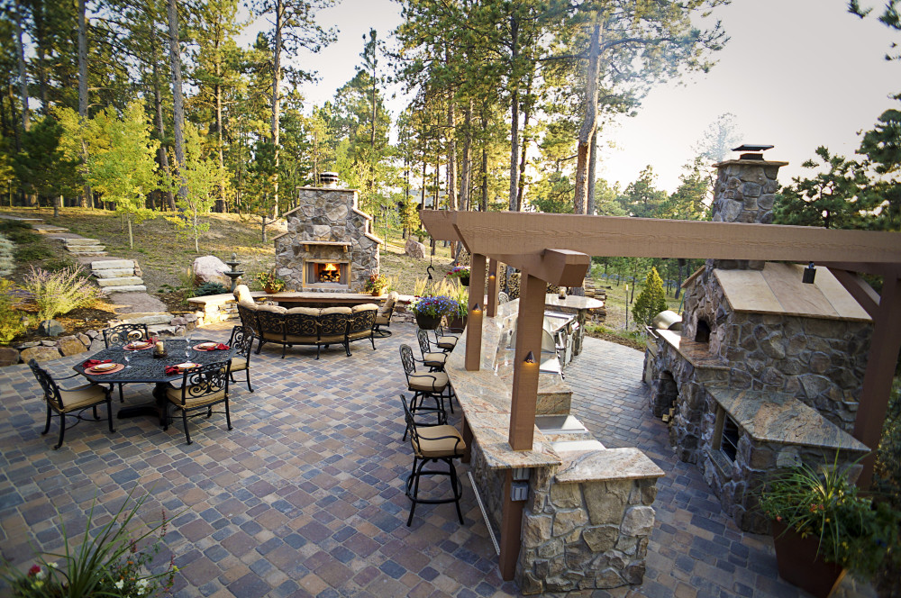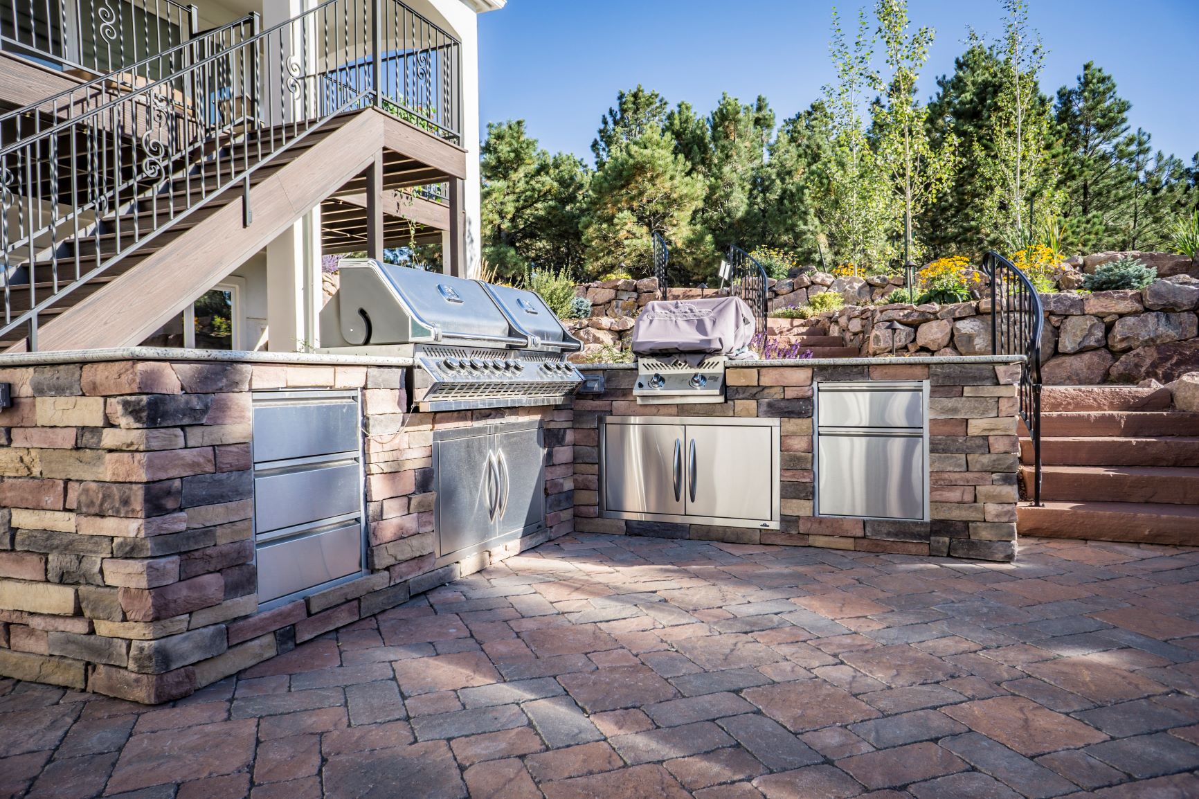 As a full-service Colorado Springs landscaping company, we can design and build custom outdoor kitchens to suit any culinary lifestyle. Built-in barbecues sized to fit any grill with cabinet storage space beneath are ideal for outdoor entertaining. Choose from tile or granite countertop surfaces. How about adding a refrigerator, stove, or warming drawer? We’ll create as much space as you desire. Steel doors can provide access to storage space under the grill. We also match the outdoor kitchen veneer with the stucco and stonework on your home to give an integrated appearance. Another nice feature is to add an elevated countertop behind the grill island to function as a serving or eating space with bar stools. Combine this with one of our outdoor fire pit designs, and you have the perfect area to keep your guests charmed.